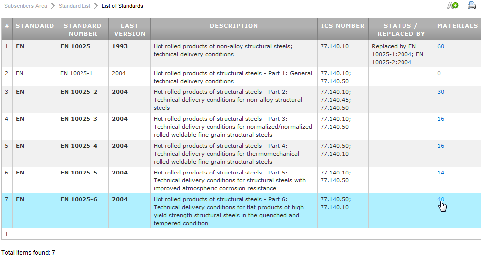 Total Materia : 汇集全球钢材标准和近似替代材料Total Materia 让查找钢材标准变得异常容易,只需点击一下鼠标即可。 只需简单的选择标准化组织的代号或者输入标准编号,就可以立刻在 30,000 多条标准中找到所需结果。比如,查找欧盟钢材标准 10025,您只需在标准编号搜索项中填入 10025,并在标准下拉菜单中选择欧盟标准即可。 结果列表由 欧盟钢材标准 10025 的 7 个部分组成,包括:标准名称、最新颁布年份、当前状态(有效、被替代等),以及该标准中所定义的所有材料牌号的快速链接。其中的每个部分都又对应了大量相关材料。 点击材料快速链接,您就可以看到该标准定义的所有材料牌号的列表。 点击列表中的材料牌号,即可查看该材料的详细性能数据和近似替代材料等信息。 |